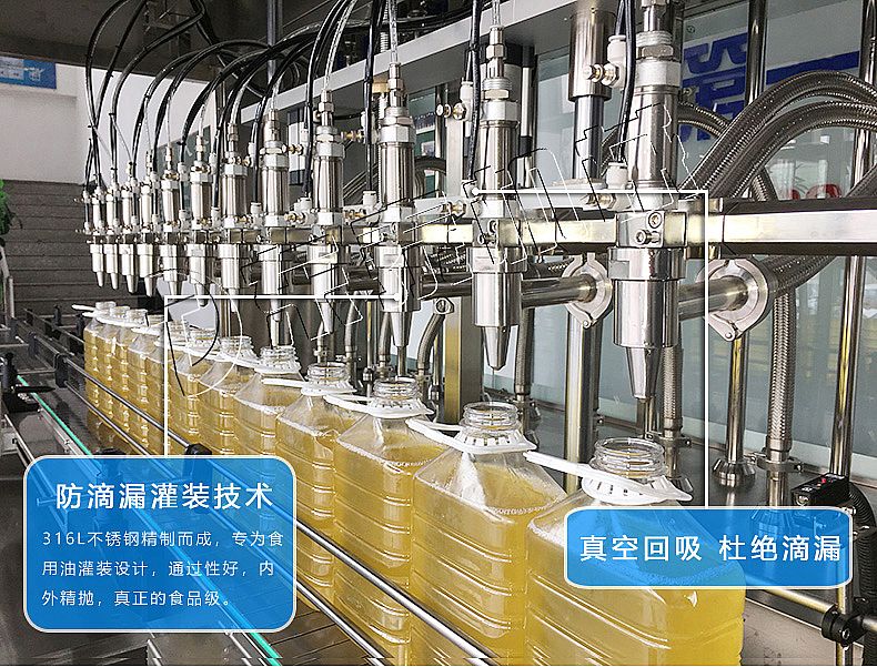 設(shè)備采用高精度的旋轉(zhuǎn)編碼器計(jì)量,保證了1%的灌裝精度,在保證灌裝精度的同時(shí),提高了20%-35%的灌裝速度,操作簡單,維護(hù)方便,節(jié)約人工成本,生產(chǎn)效率更高。 八大優(yōu)勢: 1.316L不銹鋼防滴漏灌裝頭,專為食用油灌裝設(shè)計(jì),通過性好,內(nèi)外精拋。 2.鏈接儲(chǔ)料罐通過動(dòng)力經(jīng)過進(jìn)料口注入儲(chǔ)料罐。 3.氣管與料管顏色區(qū)分,方便維護(hù)及更換,黑色氣管,白色真空回吸管。 4.裝有接料槽,防止調(diào)試的時(shí)候或者出故障的時(shí)候物料灑地上以及清理麻煩。 5.電子控制模塊,所有控制由軟件編程控制,維護(hù)方便。 6.人機(jī)界面,通過智能化系統(tǒng)控制整機(jī)參數(shù),調(diào)整整機(jī)運(yùn)行。 7.食品級(jí)304不銹鋼機(jī)身,符合食品衛(wèi)生標(biāo)準(zhǔn)。 8.變頻動(dòng)力分開,輸送帶的啟動(dòng)和停止均有緩沖,保證輸送平穩(wěn),杜絕倒瓶,濺料現(xiàn)象