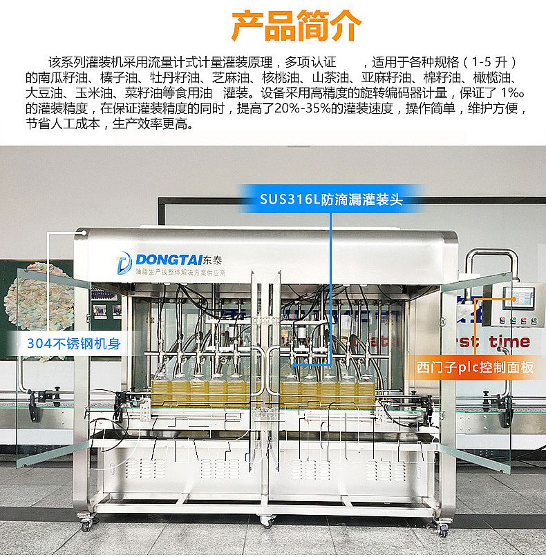 該系列灌裝機(jī)采用流量計式計量灌裝原理,多項技術(shù)認(rèn)證,適用于各種規(guī)格(1-5升)的南瓜籽油、榛子油、牡丹籽油、芝麻油、山茶油、亞麻籽油、棉籽油、橄欖油、大豆油、玉米油、菜籽油等食用油灌裝。設(shè)備采用高精度的旋轉(zhuǎn)編碼器計量,保證了1%的灌裝精度,在保證灌裝精度的同時,提高了20%-35%的灌裝速度,操作簡單,維護(hù)方便,節(jié)約人工成本,生產(chǎn)效率更高。