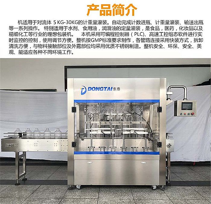 本機適用于對流體5kg-30kg的計重量灌裝。自動完成計數(shù)進瓶、計重量灌裝、輸送出瓶等一系列操作。 特別適用于水劑、食用油,潤滑油的定量灌裝,是食品,醫(yī)藥,化妝品以及精細化工等行業(yè)的理想包裝機。 本機采用可編程控制器(PLC)、高速工控組態(tài)軟件進行實時監(jiān)控的控制,使用調(diào)節(jié)方便。整機按GMP標(biāo)準(zhǔn)要求制作,各管路連接采用快裝方式,拆卸清洗方便,與物料接觸部位及外露部位均采用優(yōu)質(zhì)不銹鋼制造。整機安全、環(huán)保、安全、美觀、能適應(yīng)各種不同環(huán)境工作。