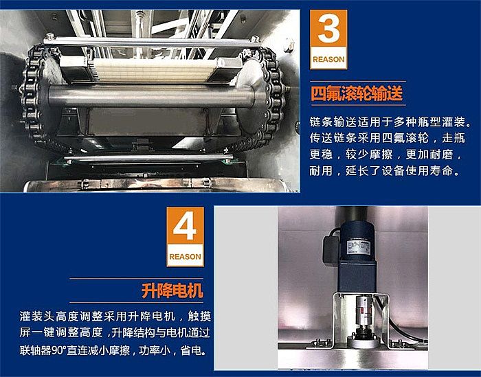 3、灌裝頭高度調(diào)整采用升降電機,,觸摸屏一鍵調(diào)整高度,升降結(jié)構(gòu)與泵通過聯(lián)軸器90°直連減小摩擦,功率小,省電;