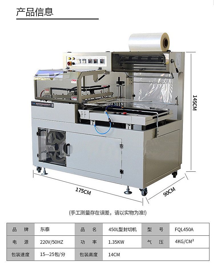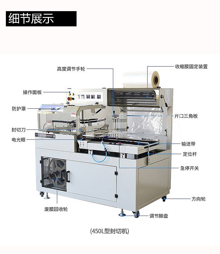 1.本機是一款全自動操作的L型封切及收縮包裝的設(shè)備,可連接各種自動化包裝的流水線作業(yè)。