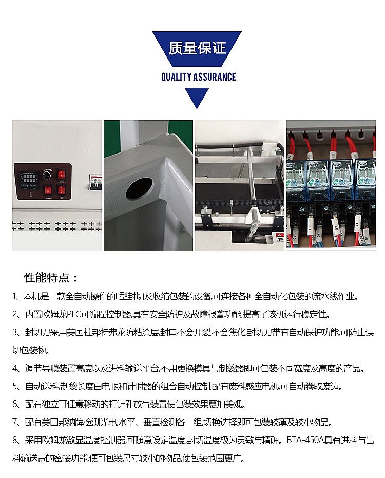 8.采用歐姆龍數(shù)顯溫度控制器,可隨意設(shè)定溫度,封切溫度較為靈敏與精確。BTA-450A具有進料與出料輸送帶的密接功能,便可包裝較小的物品,使包裝范圍更廣。