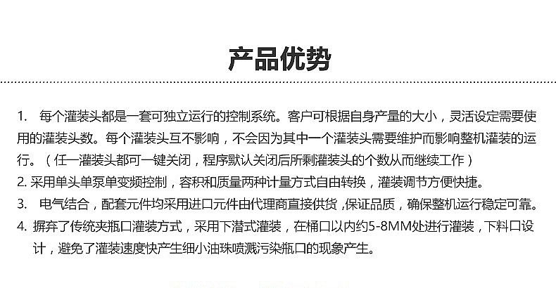 8.采用防滴漏與拉絲的灌裝悶頭、防高泡產(chǎn)品的灌裝升降系統(tǒng)、確保瓶口定位的定位系統(tǒng)和液位控制系統(tǒng)